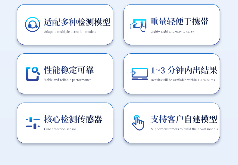 | ◆ 進(jìn)口核心檢測傳感器,性能穩(wěn)定可靠; | ◆ 快速無損檢測,1~3 分鐘內(nèi)出結(jié)果; | ◆ 10 吋觸屏操作簡單,使用方便; | ◆ 適用性廣,可適配多種檢測模型; | ◆ 支持客戶自建模型; | ◆ 體積小、重量輕,便于攜帶; |