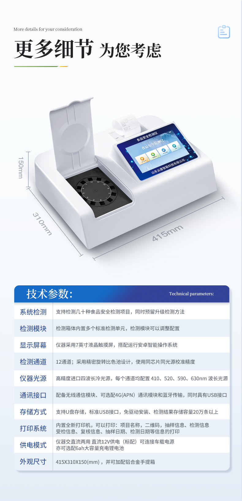 1、儀器采用臺式一體化系統(tǒng)檢測技術,將分光光度模塊、數(shù)字化管理模塊、無線通訊模塊高度集成于一體,支持檢測幾十種食品安全檢測項目,同時預留升級檢測方法。
