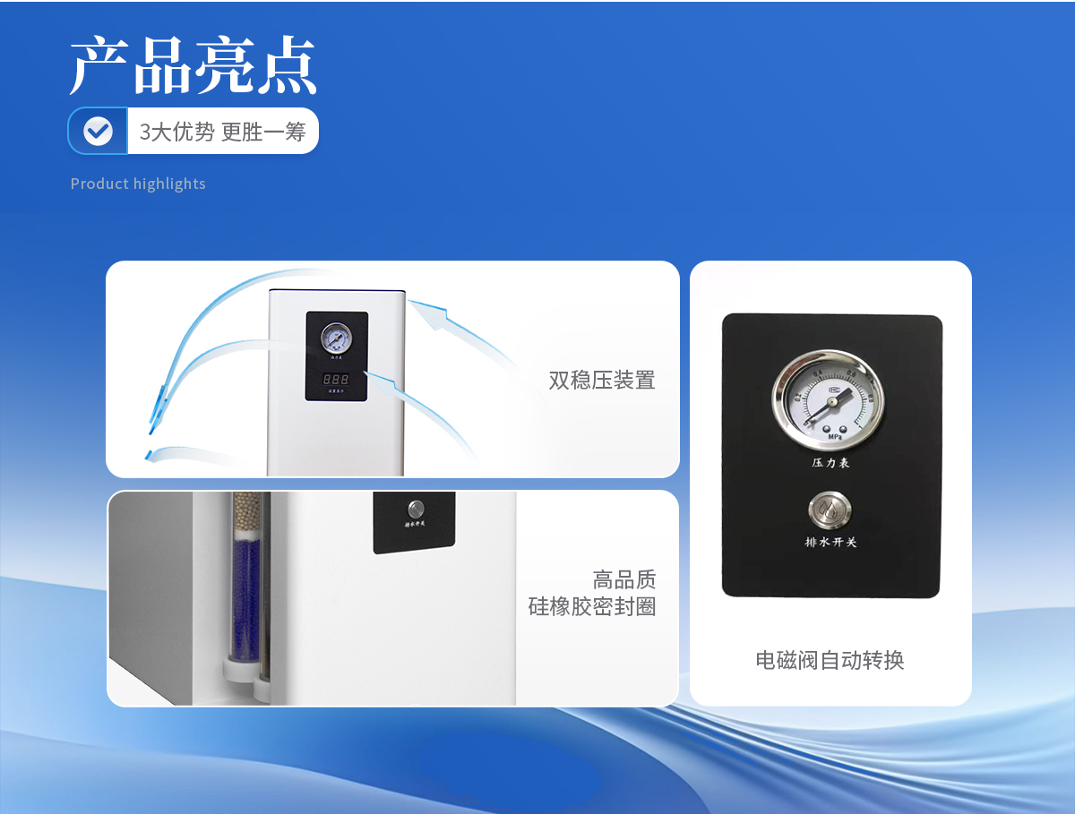 1、雙穩(wěn)壓裝置,確保高精度穩(wěn)壓條件下氣體流量的穩(wěn)定性。    2、電磁閥自動(dòng)轉(zhuǎn)換,徹底杜絕了電磁閥在自動(dòng)放水時(shí)產(chǎn)生的連續(xù)噪音,實(shí)現(xiàn)放水、轉(zhuǎn)換一體化。    3、儀器內(nèi)部采用硅橡膠圈,含硫量低有效提高氣體質(zhì)量,保證色譜基線穩(wěn)定。    4、體積小,雙支FV型亞克力過濾器,耐壓高,不會(huì)因工作環(huán)境及腐蝕氣體的影響,導(dǎo)致過濾管變形,開裂而產(chǎn)生漏氣現(xiàn)象,可持久使用,一勞永逸。