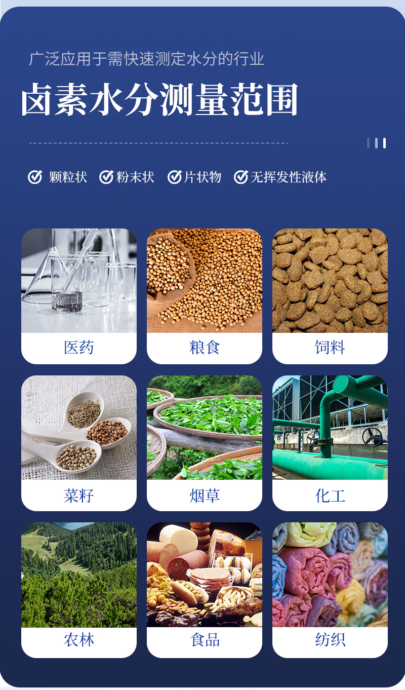 鹵素水分儀用于如:醫(yī)藥、塑膠、化工、食品、糧食、飼料、鈣鎂、質(zhì)量監(jiān)督檢驗(yàn)、等各行業(yè)中的生產(chǎn)過與實(shí)驗(yàn)過程中, 具有良好重現(xiàn)性的水分測定結(jié)果;清晰的按鍵和水分測定信息顯示,實(shí)現(xiàn)直觀簡單地儀器操作;創(chuàng)新的預(yù)先存儲的16種不同樣品水分測定方法數(shù)據(jù)庫,使得測試方法的開發(fā)快速、簡單