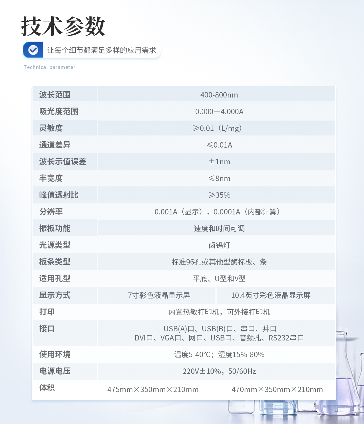 | 系統(tǒng):7英寸彩色觸摸屏,安卓系統(tǒng) | 讀數(shù)范圍 :0-4.000Abs | 濾光片帶寬:8~10nm | 分辨率:0.001Abs | 波長(zhǎng)范圍:340-750nm覆蓋整個(gè)可見(jiàn)光波長(zhǎng) | 線(xiàn)性范圍:0~3.0Abs,士1%; 3~4.0Abs, 土2% (@405nm) | 準(zhǔn)確性:士1% (0-3Abs) 士2% (3- 4Abs) (@405nm) | **性:CV≤0.2%(0-3Abs) CV≤1.0%(3- 4Abs)標(biāo)準(zhǔn)測(cè)量模式 (@405nm) | 濾光片:8片濾光片輪,標(biāo)配4塊濾光片; 405nm,450nm,492nm,630nm,另可選; 配340nm-750nm波長(zhǎng)濾光片 | 測(cè)量速度: (<6S, 96孔板整板檢測(cè),快速測(cè)量模式;單波長(zhǎng)<15s/96孔,雙波長(zhǎng)<28s/96孔(標(biāo)準(zhǔn)測(cè)量模式) | 內(nèi)存:可存儲(chǔ)200個(gè)測(cè)量程序和10萬(wàn)個(gè)測(cè)結(jié)果(96孔板) | 接口:3個(gè)USB接口,分別用于連接電腦,打印機(jī)和U盤(pán)掃碼槍 | 光源:6V10W鹵素?zé)簦瑝勖蛇_(dá)2000h | 外形尺寸:W440mm×D295mm×H225mm | 電源:AC100-240V, 50-60Hz, 2A | 凈重:10kg |