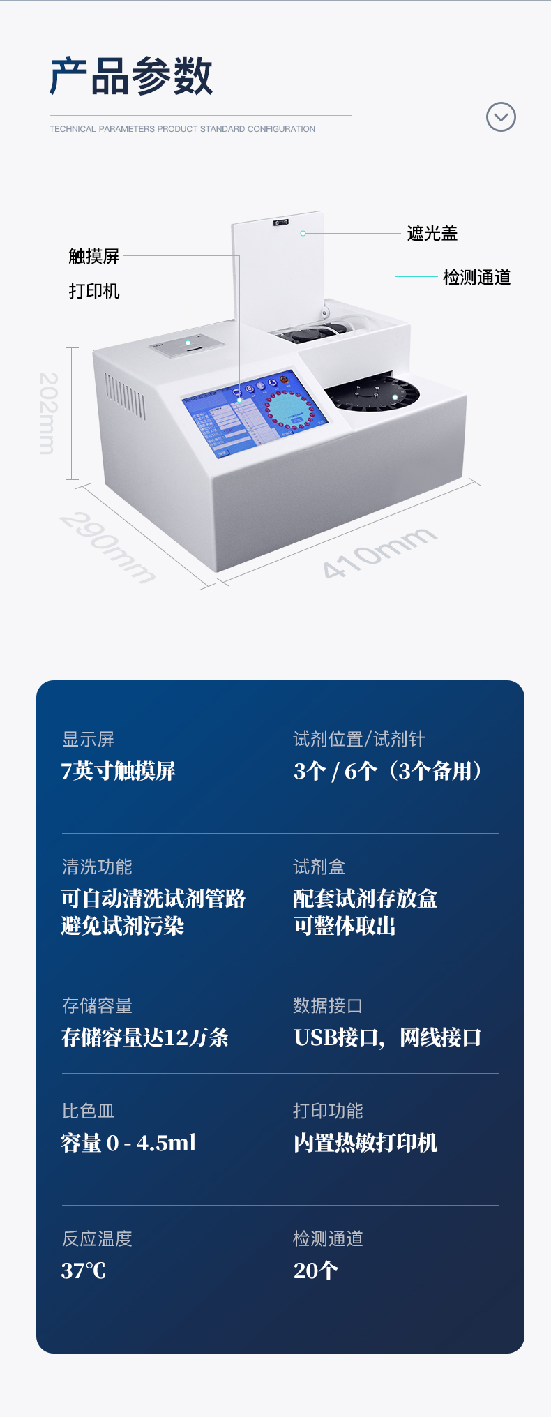 | 波長配置:410 | 試 劑 針:3根 | 檢測通道:20個 | 反應(yīng)溫度:37℃,儀器具有自動加溫溫控系統(tǒng) | 觸 摸 屏:7寸觸摸屏,可單機(jī)操作 | 比 色 皿:容量 0 - 4.5ml | 試 劑 盒:配套試劑存放盒,可整體取出 | 清洗功能:可自動清洗試劑管路,避免試劑污染 | 加樣功能:儀器按照試劑要求自動、按時、按量加入試劑,提高工作效率 | 自動混勻:儀器測試過程中自動震蕩混勻保證試劑充分反應(yīng) | 實(shí)時監(jiān)控:儀器測試過程中顯示實(shí)時運(yùn)行狀態(tài) | 打印功能:內(nèi)置熱敏打印機(jī),可快速打印檢測結(jié)果,方便數(shù)據(jù)留存 | 數(shù)據(jù)存儲:大容量存儲器,能存儲12萬條數(shù)據(jù) | 數(shù)據(jù)接口:外接USB接口,網(wǎng)線接口 | 網(wǎng)絡(luò)連接:可連接有線網(wǎng)絡(luò)和無線wifi | 上位機(jī)軟件:儀器配套電腦端上位機(jī)軟件,可通過軟件進(jìn)行寫入?yún)?shù)及讀取數(shù)據(jù) | 樣本檢測:儀器自動對未正常放置的樣本或異常的樣本進(jìn)行檢查并報警提示 | 試劑檢測:儀器測試前和測試過程中時刻對試劑進(jìn)行檢查,檢查試劑是否缺失,如有異常儀器會進(jìn)行報警提示,對已經(jīng)加入試劑的樣本進(jìn)行正常測試,不影響測試結(jié)果,對未測試的樣本停止測試。 | 數(shù)據(jù)上傳:儀器數(shù)據(jù)可傳入電腦端,按照客戶需求進(jìn)行保存或打印 | 儀器重量:約7KG | 儀器尺寸:410mm*290mm*202mm |