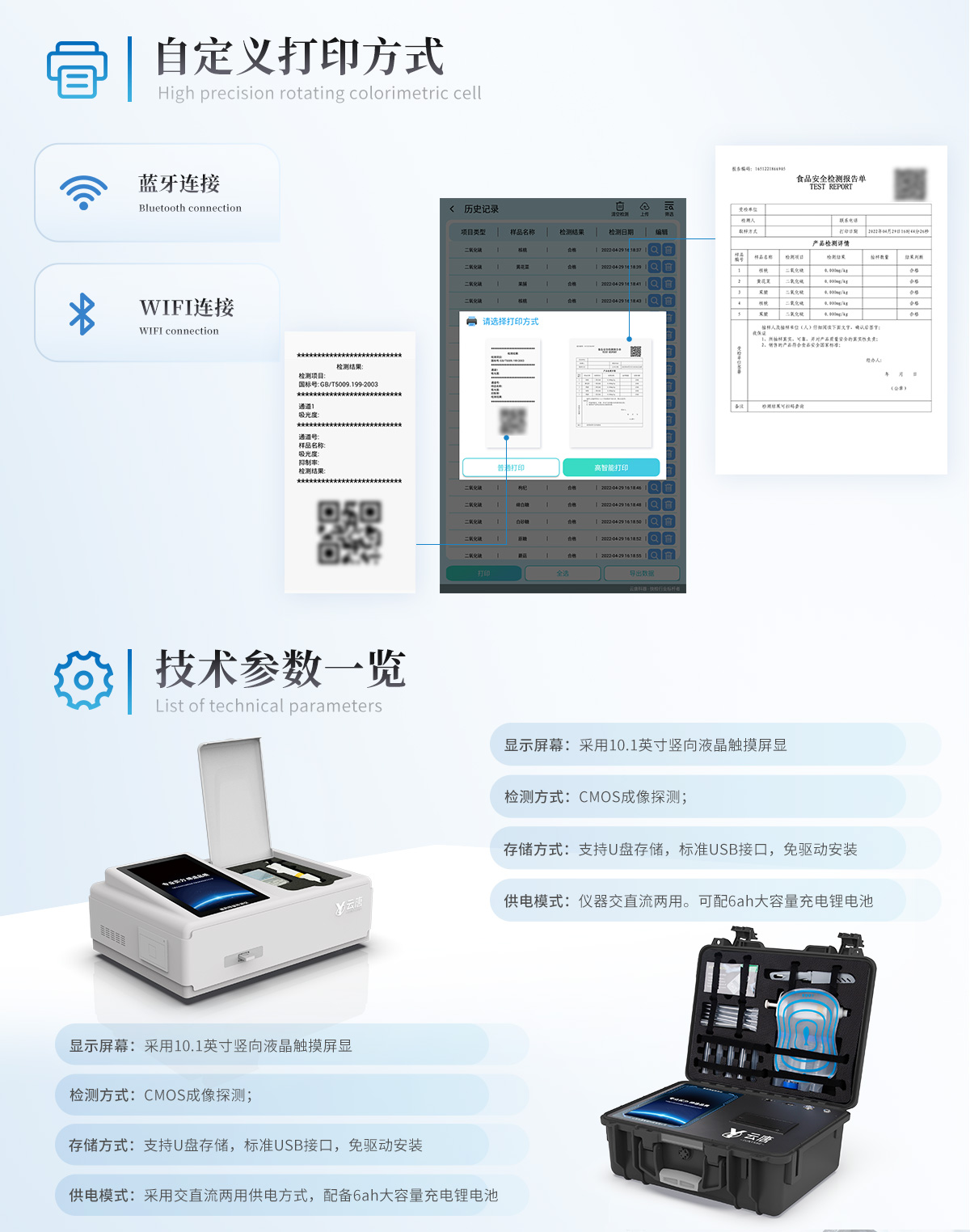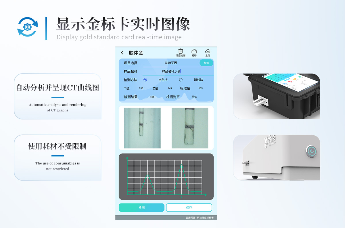 | 儀器采用10.1英寸液晶觸摸屏顯,搭配運(yùn)行安卓智能操作系統(tǒng),主控芯片采用ARM Cortex-A7,RK3288/4核處理器,主頻1.88Ghz,運(yùn)轉(zhuǎn)速度更快速,性能更強(qiáng)。 | 儀器功能包括:膠體金檢測(cè)模塊、數(shù)字化管理模塊、無線通訊模塊等,可以滿足同一軟件下實(shí)現(xiàn)所有檢測(cè)項(xiàng)目的檢測(cè),并在同一窗口展示檢測(cè)結(jié)果。 | 一體化臺(tái)式快檢設(shè)備,采用交直流兩用供電方式,可連接車載電源,配備6ah大容量充電鋰電池,可以滿足現(xiàn)場(chǎng)及流動(dòng)檢測(cè)使用的需求。儀器尺寸:43×35×20cm, 主機(jī)凈重:5.1kg | 系統(tǒng)自帶數(shù)據(jù)集成模塊,設(shè)備首頁(yè)自動(dòng)統(tǒng)計(jì)檢測(cè)數(shù)據(jù)包含:周檢測(cè)數(shù)據(jù)、月檢測(cè)數(shù)據(jù),全部檢測(cè)總數(shù)量,均包含檢測(cè)總數(shù),合格數(shù),不合格數(shù),以及相關(guān)柱形分析圖,對(duì)各項(xiàng)檢測(cè)數(shù)據(jù)清晰掌握,無需電腦查詢,更加快捷直觀。 | 儀器具有任務(wù)預(yù)設(shè)模塊,可在樣品送檢前提前預(yù)設(shè)樣品名稱、檢測(cè)指標(biāo)、送檢單位等信息,樣品送檢時(shí)一鍵調(diào)取保存信息,檢測(cè)更加方便快捷。 | 直插式自動(dòng)掃描方式,可實(shí)時(shí)顯示金標(biāo)卡實(shí)時(shí)圖像,系統(tǒng)自動(dòng)分析并呈現(xiàn)出CT曲線圖,CT線自動(dòng)識(shí)別,無需手動(dòng)調(diào)整,完成檢測(cè)后自動(dòng)退出檢測(cè)卡。 | 結(jié)果判定線可修改,對(duì)照值標(biāo)定值可保存,斷電不丟失數(shù)據(jù)。 | 兼容市場(chǎng)上其他膠體金卡,使用耗材不受限制,極大增強(qiáng)用戶使用體驗(yàn)。 | 儀器檢測(cè)系統(tǒng)擁有龐大數(shù)據(jù)庫(kù),并且構(gòu)建了完善的檢索、修訂功能。食品庫(kù)涵蓋多種樣品名稱,可按需添加或刪除、編輯樣品名稱;產(chǎn)品數(shù)據(jù)庫(kù)以及歷史檢測(cè)記錄支持一鍵檢索功能。 | 系統(tǒng)打印自定義化,打印格式多樣化,產(chǎn)品合格證(國(guó)家標(biāo)準(zhǔn)要求),二維碼,抽樣信息、檢測(cè)信息,受檢信息、復(fù)核信息、抽樣日期、檢測(cè)日期等信息結(jié)果,可按需求自行設(shè)置打印內(nèi)容。 | A4紙版本報(bào)告打印功能(可選配):設(shè)備擁有兩種結(jié)果展示方式,可以自動(dòng)生成A4打印模板和小票打印模板兩種樣式,可通過WiFi及網(wǎng)線等方式鏈接外置打印機(jī)可進(jìn)行打印 | 儀器具有 wifi 聯(lián)網(wǎng)上傳、RJ45網(wǎng)線連接功能,可以快速上傳數(shù)據(jù)。同步對(duì)接監(jiān)管平臺(tái),數(shù)據(jù)可局域網(wǎng)和互聯(lián)網(wǎng)數(shù)據(jù)上傳,檢測(cè)結(jié)果直接傳至食品安全監(jiān)管平臺(tái)。進(jìn)行區(qū)域食品安全監(jiān)管及大數(shù)據(jù)分析處理與數(shù)據(jù)統(tǒng)計(jì),檢測(cè)區(qū)域食品安全長(zhǎng)短期動(dòng)態(tài),達(dá)到食品安全問題預(yù)估、預(yù)警。 | 設(shè)備支持U盤存儲(chǔ),標(biāo)準(zhǔn)USB接口,免驅(qū)動(dòng)安裝。檢測(cè)結(jié)果存儲(chǔ)容量20萬條以上,可生成Excel表格,進(jìn)行一鍵拷貝,并具有登錄保護(hù)功能,可設(shè)置用戶名及密碼,規(guī)范不同人員操作權(quán)限,防止非工作人員操作,并且可以進(jìn)行重新校準(zhǔn)、鎖定、恢復(fù)出廠設(shè)置功能。儀器固件可升級(jí),后期檢測(cè)項(xiàng)目可擴(kuò)充。 | 儀器具備遠(yuǎn)程升級(jí)功能,可定向分客戶分儀器更新,開機(jī)后自動(dòng)更新,并可持續(xù)性免費(fèi)更新系統(tǒng)版本,無需像傳統(tǒng)產(chǎn)品返廠更新,節(jié)省時(shí)間及人力成本并避免了物流運(yùn)輸返廠升級(jí)導(dǎo)致設(shè)備損壞的潛在風(fēng)險(xiǎn)。 |