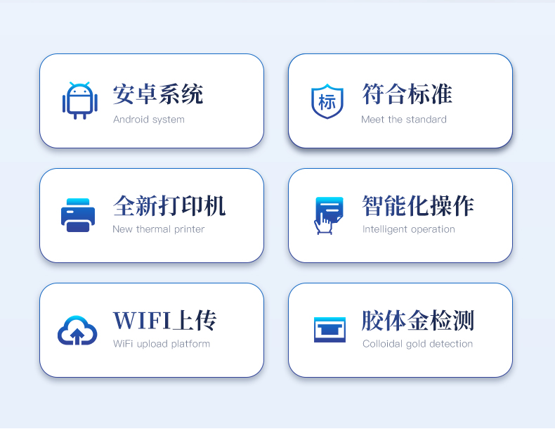 | 機(jī)箱采用工業(yè)級ABS工程塑料箱,方便攜帶,穩(wěn)固耐用,便于流動(dòng)測試。 | 安卓智能操作系統(tǒng),采用更加**和人性化操作,儀器具有wifi聯(lián)網(wǎng)上傳、4G聯(lián)網(wǎng)傳輸、GPRS無線遠(yuǎn)傳、網(wǎng)線連接功能,快速上傳數(shù)據(jù)。 | 智能化程度高,儀器具有自檢功能:具有開機(jī)自檢和調(diào)零功能,具有自動(dòng)檢測重復(fù)性功能。 | 新一代高速熱敏打印機(jī),檢測完成可自動(dòng)打印檢測報(bào)告和二維碼。 | 儀器帶有監(jiān)管平臺(tái),數(shù)據(jù)可局域網(wǎng)和互聯(lián)網(wǎng)數(shù)據(jù)上傳,檢測結(jié)果直接傳至食品安全監(jiān)管平臺(tái)。進(jìn)行區(qū)域食品安全監(jiān)管及大數(shù)據(jù)分析處理與數(shù)據(jù)統(tǒng)計(jì),檢測區(qū)域食品安全長短期動(dòng)態(tài),達(dá)到食品安全問題預(yù)估、預(yù)警 | 一體化主機(jī),包含食品安全檢測模塊、多通道農(nóng)藥殘留檢測模塊、膠體金免疫層析檢測模塊。 | 一體化便攜式快檢設(shè)備,滿足現(xiàn)場及流動(dòng)檢測使用需求,能夠在同一軟件下實(shí)現(xiàn)所有檢測項(xiàng)目的檢測,并可通過同一窗口直觀顯示檢測結(jié)果。 | 膠體金模塊檢測方式:軌道式自動(dòng)傳輸掃描,檢測完成后自動(dòng)退出檢測卡。 | CT線自動(dòng)識(shí)別,無需手動(dòng)調(diào)整。 | 儀器具有品類多種類樣品菜單庫,可靈活選擇檢測樣品,不同的檢測通道可同時(shí)檢測不同的樣品項(xiàng)目。 | 樣品處理簡單省力,整體操作快速、安全、便捷。 | 高靈敏度,高檢測精度,高重復(fù)性精度,掃描式高精度光學(xué)傳感器。 | 內(nèi)置強(qiáng)大的數(shù)據(jù)庫,可在儀器上直接選擇樣品名稱、檢測指標(biāo)、送檢單位等信息,也可在儀器上直接編輯錄入樣品名稱、檢測指標(biāo)、送檢單位等信息并保存進(jìn)樣品數(shù)據(jù)庫。 | 儀器具有自身保護(hù)功能,可設(shè)置用戶名及密碼,防止非工作人員操作等。 | 儀器具有重新校準(zhǔn)、鎖定、恢復(fù)出廠設(shè)置功能。 | 支持U盤存儲(chǔ)。 結(jié)果判定線可修改,對照值標(biāo)定值可保存,斷電不丟失數(shù)據(jù)。 | 兼容市場上所有的膠體金卡,使用耗材不受限制,極大增強(qiáng)用戶使用體驗(yàn)。 |