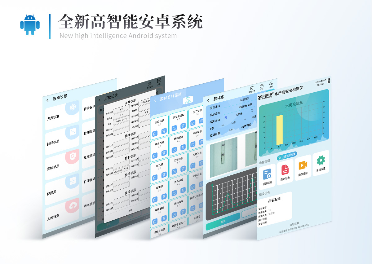 | 儀器采用10.1英寸液晶觸摸屏顯,搭配運行安卓智能操作系統(tǒng),主控芯片采用ARM Cortex-A7,RK3288/4核處理器,主頻1.88Ghz,運轉(zhuǎn)速度更快速,性能更強。 | 儀器功能包括:膠體金檢測模塊、數(shù)字化管理模塊、無線通訊模塊等,可以滿足同一軟件下實現(xiàn)所有檢測項目的檢測,并在同一窗口展示檢測結(jié)果。 | 一體化臺式快檢設(shè)備,采用交直流兩用供電方式,可連接車載電源,配備6ah大容量充電鋰電池,可以滿足現(xiàn)場及流動檢測使用的需求。儀器尺寸:43×35×20cm, 主機凈重:5.1kg | 系統(tǒng)自帶數(shù)據(jù)集成模塊,設(shè)備首頁自動統(tǒng)計檢測數(shù)據(jù)包含:周檢測數(shù)據(jù)、月檢測數(shù)據(jù),全部檢測總數(shù)量,均包含檢測總數(shù),合格數(shù),不合格數(shù),以及相關(guān)柱形分析圖,對各項檢測數(shù)據(jù)清晰掌握,無需電腦查詢,更加快捷直觀。 | 儀器具有任務(wù)預(yù)設(shè)模塊,可在樣品送檢前提前預(yù)設(shè)樣品名稱、檢測指標、送檢單位等信息,樣品送檢時一鍵調(diào)取保存信息,檢測更加方便快捷。 | 直插式自動傳輸掃描方式,可實時顯示金標卡實時圖像,系統(tǒng)自動分析并呈現(xiàn)出CT曲線圖,CT線自動識別,無需手動調(diào)整,完成檢測后自動退出檢測卡。 | 結(jié)果判定線可修改,對照值標定值可保存,斷電不丟失數(shù)據(jù)。 | 兼容市場上其他膠體金卡,使用耗材不受限制,極大增強用戶使用體驗。 | 儀器檢測系統(tǒng)擁有龐大數(shù)據(jù)庫,并且構(gòu)建了完善的檢索、修訂功能。食品庫涵蓋多種樣品名稱,可按需添加或刪除、編輯樣品名稱;產(chǎn)品數(shù)據(jù)庫以及歷史檢測記錄支持一鍵檢索功能。 | 系統(tǒng)打印自定義化,打印格式多樣化,產(chǎn)品合格證(國家標準要求),二維碼,抽樣信息、檢測信息,受檢信息、復(fù)核信息、抽樣日期、檢測日期等信息結(jié)果,可按需求自行設(shè)置打印內(nèi)容。 | A4紙版本報告打印功能(可選配):設(shè)備擁有兩種結(jié)果展示方式,可以自動生成A4打印模板和小票打印模板兩種樣式,可通過WiFi及網(wǎng)線等方式鏈接外置打印機可進行打印 | 儀器具有 wifi 聯(lián)網(wǎng)上傳、RJ45網(wǎng)線連接功能,可以快速上傳數(shù)據(jù)。同步對接監(jiān)管平臺,數(shù)據(jù)可局域網(wǎng)和互聯(lián)網(wǎng)數(shù)據(jù)上傳,檢測結(jié)果直接傳至食品安全監(jiān)管平臺。進行區(qū)域食品安全監(jiān)管及大數(shù)據(jù)分析處理與數(shù)據(jù)統(tǒng)計,檢測區(qū)域食品安全長短期動態(tài),達到食品安全問題預(yù)估、預(yù)警。 | 設(shè)備支持U盤存儲,標準USB接口,免驅(qū)動安裝。檢測結(jié)果存儲容量20萬條以上,可生成Excel表格,進行一鍵拷貝,并具有登錄保護功能,可設(shè)置用戶名及密碼,規(guī)范不同人員操作權(quán)限,防止非工作人員操作,并且可以進行重新校準、鎖定、恢復(fù)出廠設(shè)置功能。儀器固件可升級,后期檢測項目可擴充。 | 儀器具有重新校準、鎖定、恢復(fù)出廠設(shè)置功能。 | 儀器具備遠程升級功能,可定向分客戶分儀器更新,開機后自動更新,并可持續(xù)性免費更新系統(tǒng)版本,無需像傳統(tǒng)產(chǎn)品返廠更新,節(jié)省時間及人力成本并避免了物流運輸返廠升級導(dǎo)致設(shè)備損壞的潛在風險。 |