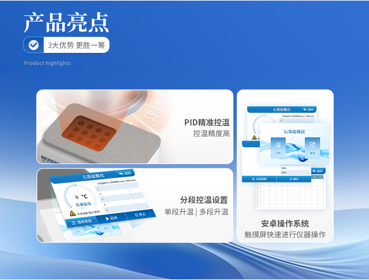 | 使用5寸彩色觸摸屏進行儀器操作,配備安卓操作系統(tǒng),方便快捷。 | 采用PID 控溫技術,控溫精度高,升溫速度快, 從室溫到260℃僅需25分鐘。 | 分段控溫設置,即可單段升溫,也可多段升溫,設置靈活,儀器將自動按順序完成。更適于易產生泡沫的樣品。 | 采用優(yōu)質石墨爐內芯,平均溫差較小,樣品效果一致性好,熱傳導效率更高。石墨塊具有特氟龍涂層,耐腐蝕,延長使用壽命。 |