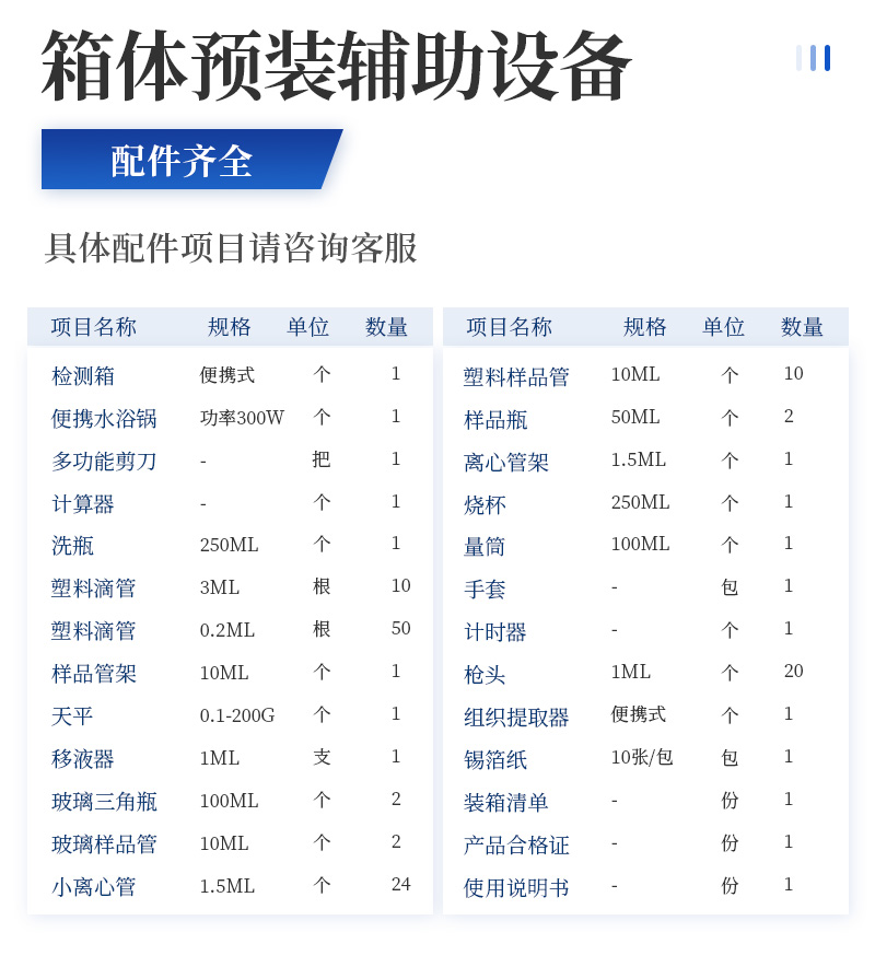序號                                項目品       名  規(guī) 格                                檢出限                                單位                                數(shù)量                                1                                箱體                                食品安全快速檢測箱I                                便攜式                                /                                個                                1                                2                                實驗器材                                空氣吹干機                                功率:450W                                /                                個                                1                                微型離心機                                5000轉(zhuǎn)/分鐘                                /                                個                                1                                多功能攪拌機                                轉(zhuǎn)速:18000-22000轉(zhuǎn)/分鐘                                /                                臺                                1                                天平                                0.1-200g                                /                                個                                1                                移液器                                1mL                                /                                個                                1                                1ml 吸頭盒                                內(nèi)含吸頭                                /                                個                                1                                多功能剪刀                                -                                /                                個                                1                                樣品管架                                10ml                                /                                個                                1                                計時器                                -                                /                                個                                1                                塑料樣品管                                10ml                                /                                個                                20                                小離心管                                1.5ml                                /                                個                                50                                3                                水產(chǎn)品安全快速檢測卡                                氯霉素檢測卡                                10次/盒                                0.3ppb                                盒                                1                                磺胺類檢測卡                                10次/盒                                20ppb                                盒                                1                                孔雀石綠檢測卡                                10次/盒                                2ppb                                盒                                1                                呋喃西林檢測卡                                10次/盒                                0.5ppb                                盒                                1                                呋喃妥因檢測卡                                10次/盒                                0.5ppb                                盒                                1                                呋喃唑酮檢測卡                                10次/盒                                0.5ppb                                盒                                1                                呋喃它酮檢測卡                                10次/盒                                0.5ppb                                盒                                1                                4                                裝箱清單                                ——                     
