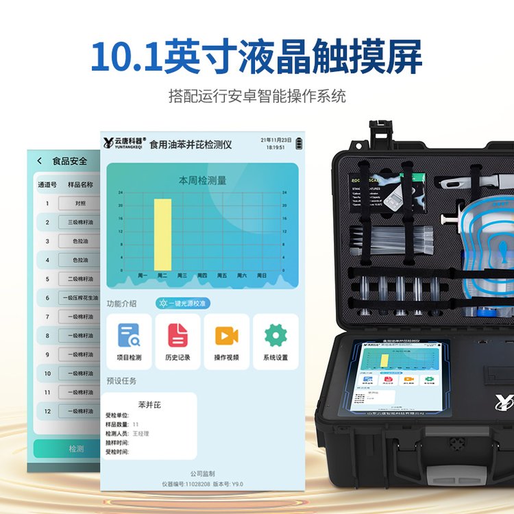 | 儀器采用10.1英寸液晶觸摸屏顯,搭配運(yùn)行安卓智能操作系統(tǒng),主控芯片采用ARM Cortex-A7,RK3288/4核處理器,主頻1.88Ghz,運(yùn)轉(zhuǎn)速度更快速,性能更強(qiáng)。 | 儀器功能包括:膠體金檢測(cè)模塊、數(shù)字化管理模塊、無(wú)線通訊模塊等,可以滿足同一軟件下實(shí)現(xiàn)所有檢測(cè)項(xiàng)目的檢測(cè),并在同一窗口展示檢測(cè)結(jié)果。 | 一體化便攜式快檢設(shè)備,采用交直流兩用供電方式,可連接車載電源,配備6ah大容量充電鋰電池,可以滿足現(xiàn)場(chǎng)及流動(dòng)檢測(cè)使用的需求。儀器尺寸:43×35×20cm, 主機(jī)凈重:5.1kg | ★系統(tǒng)自帶數(shù)據(jù)集成模塊,設(shè)備首頁(yè)自動(dòng)統(tǒng)計(jì)檢測(cè)數(shù)據(jù)包含:周檢測(cè)數(shù)據(jù)、月檢測(cè)數(shù)據(jù),全部檢測(cè)總數(shù)量,均包含檢測(cè)總數(shù),合格數(shù),不合格數(shù),以及相關(guān)柱形分析圖,對(duì)各項(xiàng)檢測(cè)數(shù)據(jù)清晰掌握,無(wú)需電腦查詢,更加快捷直觀。 | 軌道式自動(dòng)傳輸掃描方式,可實(shí)時(shí)顯示金標(biāo)卡實(shí)時(shí)圖像,系統(tǒng)自動(dòng)分析并呈現(xiàn)出CT曲線圖,CT線自動(dòng)識(shí)別,無(wú)需手動(dòng)調(diào)整,完成檢測(cè)后自動(dòng)退出檢測(cè)卡。 | 結(jié)果判定線可修改,對(duì)照值標(biāo)定值可保存,斷電不丟失數(shù)據(jù)。 | 兼容市場(chǎng)上其他膠體金卡,使用耗材不受限制,極大增強(qiáng)用戶使用體驗(yàn)。 | 儀器檢測(cè)系統(tǒng)擁有龐大數(shù)據(jù)庫(kù),并且構(gòu)建了完善的檢索、修訂功能。 | 食品庫(kù)涵蓋多種樣品名稱,可按需添加或刪除、編輯樣品名稱; | 產(chǎn)品數(shù)據(jù)庫(kù)以及歷史檢測(cè)記錄支持一鍵檢索功能。 | 系統(tǒng)打印自定義化,打印格式多樣化,產(chǎn)品合格證(國(guó)家標(biāo)準(zhǔn)要求),二維碼,抽樣信息、檢測(cè)信息,受檢信息、復(fù)核信息、抽樣日期、檢測(cè)日期等信息結(jié)果,可按需求自行設(shè)置打印內(nèi)容。 | 內(nèi)置限量規(guī)判程序:具有限量查詢、添加物質(zhì)合規(guī)判定系統(tǒng)。檢測(cè)出結(jié)果后,系統(tǒng)自動(dòng)調(diào)用系統(tǒng)數(shù)據(jù)庫(kù)中相關(guān)國(guó)標(biāo)進(jìn)行比對(duì)判定,客觀顯示判定結(jié)果是否合格,檢測(cè)對(duì)象是否允許添加該物質(zhì),若允許添加則能準(zhǔn)確獲得食品中添加該物質(zhì)的限量及添加依據(jù)的國(guó)家標(biāo)準(zhǔn)。 | 儀器具有 wifi 聯(lián)網(wǎng)上傳、RJ45網(wǎng)線連接功能,可以快速上傳數(shù)據(jù)。同步對(duì)接監(jiān)管平臺(tái),數(shù)據(jù)可局域網(wǎng)和互聯(lián)網(wǎng)數(shù)據(jù)上傳,檢測(cè)結(jié)果直接傳至食品安全監(jiān)管平臺(tái)。進(jìn)行區(qū)域食品安全監(jiān)管及大數(shù)據(jù)分析處理與數(shù)據(jù)統(tǒng)計(jì),檢測(cè)區(qū)域食品安全長(zhǎng)短期動(dòng)態(tài),達(dá)到食品安全問(wèn)題預(yù)估、預(yù)警。 | 設(shè)備支持U盤存儲(chǔ),標(biāo)準(zhǔn)USB接口,免驅(qū)動(dòng)安裝。檢測(cè)結(jié)果存儲(chǔ)容量20萬(wàn)條以上,可生成Excel表格,進(jìn)行一鍵拷貝,并具有登錄保護(hù)功能,可設(shè)置用戶名及密碼,規(guī)范不同人員操作權(quán)限,防止非工作人員操作,并且可以進(jìn)行重新校準(zhǔn)、鎖定、恢復(fù)出廠設(shè)置功能。儀器固件可升級(jí),后期檢測(cè)項(xiàng)目可擴(kuò)充。 | 儀器加入遠(yuǎn)程升級(jí)功能,可定向分客戶分儀器更新,開(kāi)機(jī)后自動(dòng)更新,客戶無(wú)需任何操作,即可升級(jí)全新項(xiàng)目。做到了無(wú)需退換機(jī)器即可實(shí)現(xiàn)實(shí)時(shí)遠(yuǎn)程升級(jí)檢測(cè)儀器。 | 可連接外部打印機(jī),打印A4紙規(guī)格的檢測(cè)報(bào)告(可選配) |