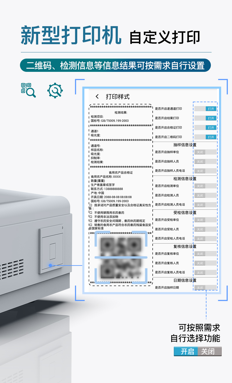 | 1、儀器采用臺(tái)式一體化系統(tǒng)檢測(cè)技術(shù),將分光光度模塊、膠體金檢測(cè)模塊、新型農(nóng)殘檢測(cè)模塊、數(shù)字化管理模塊、無(wú)線通訊模塊高度集成于一體,支持檢測(cè)200種食品安全檢測(cè)項(xiàng)目,同時(shí)預(yù)留升級(jí)檢測(cè)方法。 | 2、儀器檢測(cè)模塊標(biāo)準(zhǔn)化、智能化,檢測(cè)項(xiàng)目可隨意自由組合。檢測(cè)箱體內(nèi)置多個(gè)標(biāo)準(zhǔn)檢測(cè)單元,檢測(cè)模塊可以調(diào)整配置。 | 3、顯示屏幕:儀器采用10.1英寸豎向液晶觸摸屏顯,搭配運(yùn)行安卓智能操作系統(tǒng),主控芯片采用ARM Cortex-A7,RK3288/4核處理器,主頻1.88Ghz,操作方便,性能更強(qiáng)。 | 4、檢測(cè)通道:≥12通道;采用精密旋轉(zhuǎn)比色池設(shè)計(jì),使用同芯片同光源校準(zhǔn)精度,解決不同光源之間的誤差值,更加準(zhǔn)確**。(1-12通道間誤差0.1%,***:**202022821055.2) | 5、儀器光源:高精度進(jìn)口四波長(zhǎng)冷光源,每個(gè)通道均配置 410、520、590、630nm 波長(zhǎng)光源,標(biāo)配**的光路切換裝置,專利光路切換功能可實(shí)現(xiàn)64波長(zhǎng),并且所有檢測(cè)項(xiàng)目可實(shí)現(xiàn)所有通道同時(shí)檢測(cè)。 | 6、設(shè)備可一鍵校準(zhǔn),自動(dòng)保存校準(zhǔn)數(shù)據(jù),自動(dòng)對(duì)比校驗(yàn),得到精準(zhǔn)光源,采用Android SP存儲(chǔ)數(shù)據(jù),光源數(shù)據(jù)永不丟失,方便每一次使用。 | 7、通訊接口:配備無(wú)線通信模塊、4G(APN)通訊模塊、藍(lán)牙傳輸,同時(shí)具有雙USB接口以及RJ45網(wǎng)線接口,可以多方式實(shí)現(xiàn)數(shù)據(jù)保存及數(shù)據(jù)傳輸。 | 8、存儲(chǔ)方式:支持U盤存儲(chǔ),標(biāo)準(zhǔn)USB接口,免驅(qū)動(dòng)安裝。檢測(cè)結(jié)果存儲(chǔ)容量20萬(wàn)條以上,可生成Excel表格進(jìn)行拷貝,并具有登錄保護(hù)功能。 | 9、智能化操作系統(tǒng): | 9.1、操作系統(tǒng):儀器可在同一檢測(cè)界面自動(dòng)對(duì)應(yīng)相關(guān)檢測(cè)通道,一次性選擇1-12個(gè)樣品名稱,無(wú)需退出界面,節(jié)省操作時(shí)間。并可以對(duì)每個(gè)通道屬性和樣品信息單獨(dú)進(jìn)行編輯,例如送檢單位、人員,檢測(cè)人員等,打印時(shí)勾選打印顯示。 | 9.2、數(shù)據(jù)集成系統(tǒng):設(shè)備首頁(yè)自動(dòng)匯總分析檢測(cè)數(shù)據(jù),包含:周檢測(cè)數(shù)據(jù)、月檢測(cè)數(shù)據(jù),全部檢測(cè)總數(shù)量,均包含檢測(cè)總數(shù),合格數(shù),不合格數(shù),以及相關(guān)柱形分析圖,各項(xiàng)檢測(cè)數(shù)據(jù)一目了然,無(wú)需電腦查詢,更加快捷直觀。 | 9.3、數(shù)據(jù)庫(kù)系統(tǒng):十幾項(xiàng)數(shù)據(jù)庫(kù)分類管理儀器:包含項(xiàng)目類型、項(xiàng)目數(shù)據(jù)、檢測(cè)數(shù)據(jù)、歷史記錄、國(guó)標(biāo)信息、曲線信息、采樣信息、檢測(cè)信息、受檢信息、復(fù)核信息、圖表信息、光源校準(zhǔn)信息、打印樣式信息、樣品庫(kù)信息等等,數(shù)據(jù)庫(kù)之間互相協(xié)調(diào)聯(lián)動(dòng)保證數(shù)據(jù)的真實(shí)完整性。同時(shí)產(chǎn)品數(shù)據(jù)庫(kù)以及歷史檢測(cè)記錄支持一鍵檢索功能。 | 9.4、限量規(guī)判系統(tǒng):具有限量查詢、添加物質(zhì)合規(guī)判定系統(tǒng)。檢測(cè)出結(jié)果后,系統(tǒng)自動(dòng)調(diào)用系統(tǒng)數(shù)據(jù)庫(kù)中相關(guān)國(guó)標(biāo)進(jìn)行比對(duì)判定,客觀顯示判定結(jié)果是否合格。 | 9.5、項(xiàng)目預(yù)設(shè)系統(tǒng):儀器具有任務(wù)預(yù)設(shè)模塊,一鍵提前預(yù)設(shè),給出方便快捷的新檢測(cè)方案,每一個(gè)任務(wù)分別可以設(shè)置不同的樣品、批次、編號(hào)、來(lái)源、備注、抽樣信息、檢測(cè)信息、受檢信息、復(fù)核信息等更多信息。樣品送檢時(shí)一鍵調(diào)取保存信息,并可多次調(diào)取,大大提高檢測(cè)效率。 | 9.6、數(shù)據(jù)監(jiān)管系統(tǒng):同步對(duì)接監(jiān)管平臺(tái),數(shù)據(jù)可局域網(wǎng)和互聯(lián)網(wǎng)數(shù)據(jù)上傳,檢測(cè)結(jié)果可選擇直接傳至食品安全監(jiān)管平臺(tái)。進(jìn)行區(qū)域食品安全監(jiān)管及大數(shù)據(jù)分析處理與數(shù)據(jù)統(tǒng)計(jì),檢測(cè)區(qū)域食品安全長(zhǎng)短期動(dòng)態(tài),達(dá)到食品安全問(wèn)題預(yù)估、預(yù)警。 | 9.7.1、全新打印系統(tǒng):內(nèi)置全新打印機(jī),新創(chuàng)自定義打印方式,可按需靈活勾選控制:產(chǎn)品合格證(國(guó)家農(nóng)業(yè)部標(biāo)準(zhǔn)要求),二維碼,抽樣信息、檢測(cè)信息,受檢信息、復(fù)核信息、抽樣日期、檢測(cè)日期等信息的打印。 | 9.7.2、A4紙版本報(bào)告打印功能(選配):設(shè)備擁有兩種結(jié)果展示方式,可以自動(dòng)生成A4打印模板和小票打印模板兩種樣式,可通過(guò)WiFi及網(wǎng)線等方式鏈接外置打印機(jī)可進(jìn)行打印。 | 10、供電模式:儀器交直流兩用,直流12V供電,可連接車載電源,可配6ah大容量充電鋰電池,電量可實(shí)時(shí)顯示,方便戶外流動(dòng)測(cè)試。 | 11、膠體金檢測(cè)模塊:采用單通道CMOS成像處理技術(shù)及膠體金免疫層析技術(shù),可讀取膠體金卡數(shù)據(jù),自動(dòng)采集、處理分析,將檢