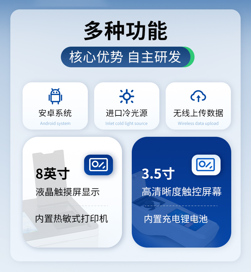 Android智能系統(tǒng),操作交互性體驗更好,更佳簡便快捷;3.5寸高清晰度觸控屏幕,數(shù)據(jù)更直觀配置監(jiān)管平臺,檢測結果可直接無線傳至平臺,進行水質長短期分析,輔助管理。內置操作流程、操作簡單、無需培訓、直接上手;檢測速度更快,現(xiàn)場讀取數(shù)據(jù);便攜式體積小,重量輕,方便戶外檢測;外形小巧美觀,工作穩(wěn)定免維護,具有較好的性價比;采用進口冷光源,光學性能穩(wěn)定,壽命長達10萬小時;交直流兩用,內置充電鋰電池,環(huán)保耐用可支持連續(xù)室內外工作。