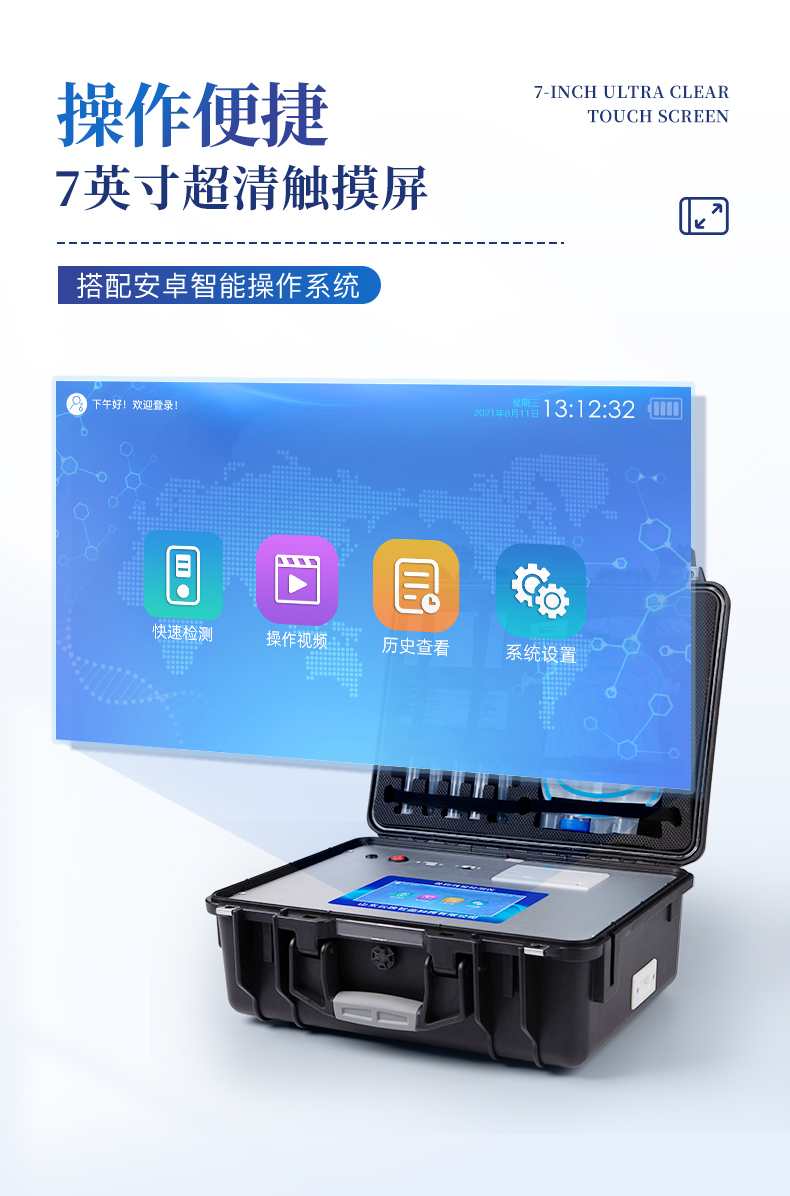 5、一體化便攜式快檢設(shè)備,滿足現(xiàn)場(chǎng)及流動(dòng)檢測(cè)使用需求,能夠在同一軟件下實(shí)現(xiàn)所有檢測(cè)項(xiàng)目的檢測(cè),并可通過同一窗口直觀顯示檢測(cè)結(jié)果。
