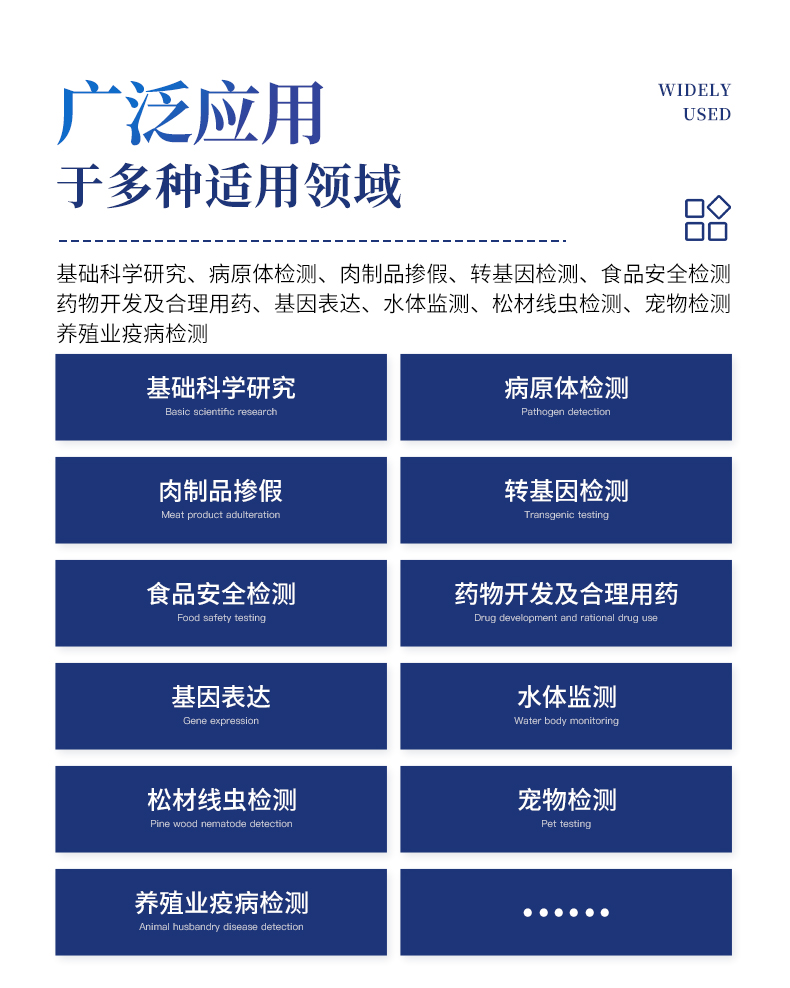 非洲豬瘟檢測儀配套非洲豬瘟病毒熒光pcr檢測試劑盒、非洲豬瘟病毒熒光pcr核酸檢測試劑盒均已經(jīng)獲得農(nóng)業(yè)農(nóng)村部產(chǎn)品批準(zhǔn),可以滿足非洲豬瘟核酸現(xiàn)場快速檢測需求??啥靠焖傩竽令惣膊≡\斷如非洲豬瘟、禽流感、豬瘟、豬藍耳、偽狂犬等疾病,廣泛應(yīng)用于養(yǎng)殖場、屠宰場、食品加工廠、肉產(chǎn)品深加工企業(yè)、農(nóng)業(yè)農(nóng)村部、畜牧局、檢驗檢疫單位使用。