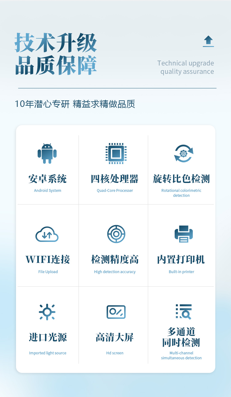 | 機器采用全新安卓智能系統(tǒng),主控芯片采用 ARM Cortex-A7,RK3288/4核處理器,主頻1.88Ghz,運轉(zhuǎn)速度更快速,穩(wěn)定性更強。 | 創(chuàng)新檢測模式: *儀器采用精密旋轉(zhuǎn)比色池設(shè)計,使用光源一致,可以解決各通道間由于光源誤差帶來的檢測結(jié)果誤差問題,檢測結(jié)果更加精準(zhǔn)。 *儀器具有自動識別比色皿檢測功能,即:將樣品比色皿放入儀器后,點擊樣品檢測,儀器自動識別比色皿進(jìn)行通道檢測。 | 供電方式:交直流兩用,直流 12V 供電,可連接車載電源,可配 6ah 大容量充電鋰電池,方便戶外流動測試。 | 顯示方式:7英寸液晶觸摸屏顯示,人性化中文操作界面,讀數(shù)直觀、簡單。 | 檢測通道:12個檢測通道,可以同時測試多個樣品,循環(huán)檢測,即放即檢,每個樣品由程序控制分別獨立工作,不會互相干擾。 | 高精光源系統(tǒng): ①儀器光源采用進(jìn)口超高亮發(fā)光二極管,光源亮度可以自動調(diào)節(jié)與校準(zhǔn) ②智能恒流穩(wěn)壓,光強自動校準(zhǔn),長時間連續(xù)工作光源無溫漂現(xiàn)象。 | 智能操作分析系統(tǒng): ①儀器具有100多種蔬菜名稱菜單庫,分類管理,并可按需添加或刪除、編輯蔬菜名稱;可在同一檢測界面自動對應(yīng)相關(guān)檢測通道一次性選擇1-24個樣品名稱,無需退出界面,節(jié)省操作時間。 ②內(nèi)置新國家限量標(biāo)準(zhǔn),與所測結(jié)果進(jìn)行現(xiàn)場比對,并持續(xù)更新標(biāo)準(zhǔn)。 | 完善的配套硬件: ①采用串口5v打印機,可選擇手動打印或者自動打印,三分鐘出打印結(jié)果,打印格式為檢測人姓名、吸光度差值、檢測時間、檢測機構(gòu)、樣品名稱及結(jié)果判定。 ②儀器具有無線上傳模塊,檢測結(jié)果可批量打印,批量上傳。 | 數(shù)據(jù)調(diào)用: ①儀器可存儲20萬條檢測結(jié)果, ②檢測結(jié)果為Excel表格,方便后期進(jìn)行數(shù)據(jù)分析與匯總報告 ③儀器采用USB2.0接口設(shè)計,支持 U 盤存儲,方便數(shù)據(jù)的存貯和移動,并可隨時與計算機直接相連,實現(xiàn)數(shù)據(jù)查詢、瀏覽、分析、統(tǒng)計、打印等。 | 后期產(chǎn)品固件可升級。 | 安全證書,放心保障:儀器具有中國計量科學(xué)研究院校準(zhǔn)證書,權(quán)威認(rèn)證,使用放心。 | 機箱采用工業(yè)級ABS工程塑料箱,方便攜帶,穩(wěn)固耐用,便于流動測試。 |