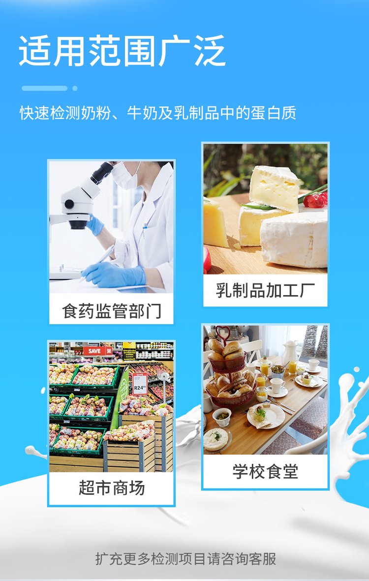 可快速檢測(cè)奶粉、牛奶及乳制品中的蛋白質(zhì),儀器預(yù)留其他項(xiàng)目檢測(cè)程序和端口,根據(jù)日后需求可方便的自主增加檢測(cè)項(xiàng)目。