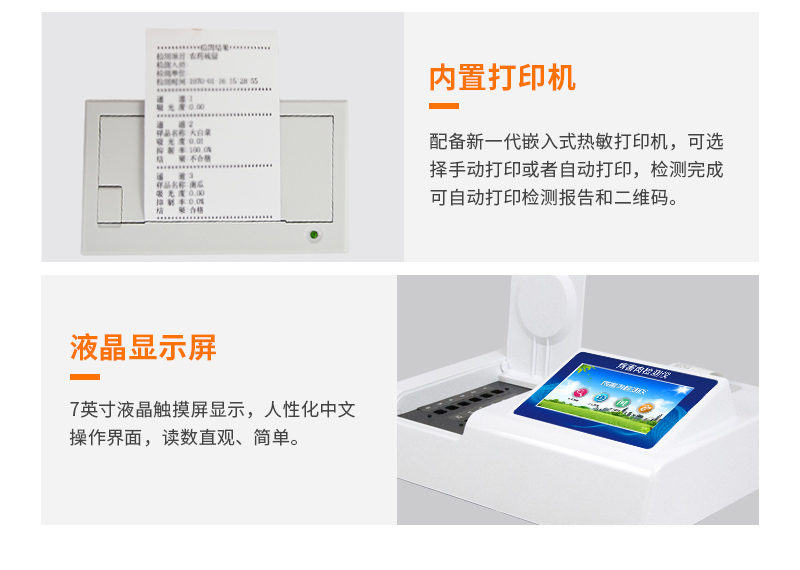 儀器采用臺式一體化系統(tǒng)檢測技術(shù),將分光光度模塊、新型農(nóng)殘檢測模塊、數(shù)字化管理模塊、無線通訊模塊高度集成于一體,支持檢測200種食品安全檢測項目,同時預(yù)留升級檢測方法。儀器檢測模塊標準化、智能化,可隨意自由組合。檢測箱體內(nèi)置多個標準檢測單元,檢測模塊可以調(diào)整配置。儀器采用全新安卓智能系統(tǒng),主控芯片采用 ARM Cortex-A7,RK3288/4核處理器,10.1寸高清液晶觸摸豎屏,更加**的UI交互界面,運轉(zhuǎn)快捷;儀器配備無線通信模塊: 4G(APN)通訊模塊、Wifi模塊,藍牙傳輸,同時具有雙USB接口以及RJ45接口能以多種方式實現(xiàn)數(shù)據(jù)保存和數(shù)據(jù)傳輸功能。創(chuàng)新檢測模式:★檢測通道:≥12通道;采用精密旋轉(zhuǎn)比色池設(shè)計,使用同芯片同光源校準精度,解決不同光源之間的誤差值。1-12通道間誤差0.1%。(***:**202022821055.2)★儀器具有自動識別比色皿檢測功能,即:將樣品比色皿放入儀器后,點擊樣品檢測,儀器自動識別比色皿進行通道檢測。進口高精光源:高精度進口四波長冷光源,通道配置 410、520、590、630nm 波長光源,一個光源芯片驅(qū)動一個光源,誤差極小,每臺設(shè)備單獨**校準光源,**比對,同時參照四種不同波段光源全方位覆蓋市面上99%的農(nóng)殘食品項目檢測。智能化操作系統(tǒng):便捷操作系統(tǒng):設(shè)備檢測時可在同一檢測界面自動對應(yīng)相關(guān)檢測通道一次性選擇1-12個樣品名稱,無須退出界面,節(jié)省操作時間。數(shù)據(jù)集成系統(tǒng):設(shè)備首頁自動統(tǒng)計檢測數(shù)據(jù)包含:周檢測數(shù)據(jù)、月檢測數(shù)據(jù),全部檢測總數(shù)量,均包含檢測總數(shù),合格數(shù),不合格數(shù),以及相關(guān)柱形分析圖,對各項檢測數(shù)據(jù)清晰掌握,無需電腦查詢,更加快捷直觀。項目預(yù)設(shè)系統(tǒng):支持添加單個及多個相同或不相同的任務(wù)預(yù)設(shè),一鍵快速調(diào)取,每一個任務(wù)分別可以設(shè)置不同的樣品、批次、編號、來源、備注、抽樣信息、檢測信息、受檢信息、復(fù)核信息等更多信息。無縫鏈接平臺和APP實時查看下發(fā)任務(wù)。數(shù)據(jù)監(jiān)管系統(tǒng):同步對接監(jiān)管平臺,數(shù)據(jù)可局域網(wǎng)和互聯(lián)網(wǎng)數(shù)據(jù)上傳,檢測結(jié)果可選擇直接傳至食品安全監(jiān)管平臺。集成OSS輸出存儲服務(wù)、區(qū)分設(shè)備定向管理應(yīng)用,進行區(qū)域食品安全監(jiān)管及大數(shù)據(jù)分析處理與數(shù)據(jù)統(tǒng)計,檢測區(qū)域食品安全長短期動態(tài),達到食品安全問題預(yù)估、預(yù)警。自定義打印系統(tǒng):內(nèi)置全新打印系統(tǒng),新創(chuàng)自定義打印方式,可按需靈活設(shè)置開啟或關(guān)閉:產(chǎn)品合格證(國家農(nóng)業(yè)部標準要求),二維碼,抽樣信息、檢測信息,受檢信息、復(fù)核信息、抽樣日期、檢測日期等信息的打印。系統(tǒng)遠程更新功能:可定向分客戶分儀器更新系統(tǒng),按照不同客戶后期實際需求添加項目,無需機器返廠,即可遠程實時升級全新系統(tǒng),節(jié)省時間成本及避免運輸造成設(shè)備損壞。儀器主機采用一體化防水、抗壓、防撞擊、防腐蝕箱體設(shè)計,同時配備交直流供電,可連接車載電源,可選配大容量充電鋰電池,滿足現(xiàn)場野外檢測需求。安全證書,放心保障:儀器具有中國計量科學(xué)研究院校準證書,權(quán)威認證。